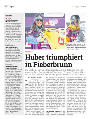 Die Lecherin Lorraine Huber siegt nach dem Erfolg in Andorra erneut auf der Freeride World Tour. Auch Thomas Feurstein landet im Spitzenfeld. Fabio Studer qualifiziert sich für das Finale.