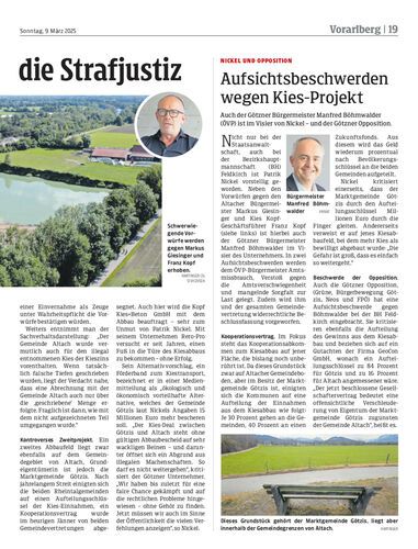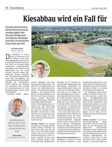 Götzner Unternehmer Patrik Nickel hat Strafanzeige gegen den Altacher Bürgermeister Markus Giesinger und Kies-Unternehmer Franz Kopf gestellt.