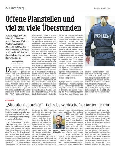 Vorarlberger Polizei kämpft mit massiven Personallücken. Parlamentarische Anfrage zeigt, dass 77 Planstellen unbesetzt sind – mit spürbaren Auswirkungen auf den Dienstbetrieb.
