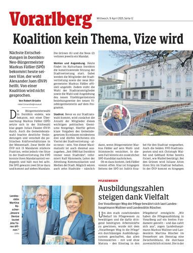 Nächste Entscheidungen in Dornbirn: Neo-Bürgermeister Markus Fäßler (SPÖ) bekommt heute seinen Vize, der wohl Alexander Juen (ÖVP) heißt. Von einer Koalition wird nicht gesprochen.