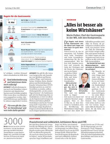 NEUE GAstfreundschaft. Heute in einer Woche dürfen die Gastronomiebetriebe wieder aufsperren. Die genauen Regeln dafür liegen nun vor. Bei Verstößen wird vorerst nicht gestraft. Seiten 2/3 Apa