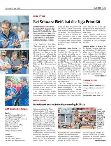 Der Startschuss im Viertelfinale des VFV-Cups erfolgt heute (18 Uhr) in Wolfurt. Eine Stunde später hat Westliga-Tabellenführer Bregenz mit Alberschwende den Leader der Vorarlbergliga zu Gast.