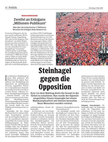 Kurz vor dem Wahltag droht die Gewalt in der Türkei zu eskalieren. Nun wurde der Oppositionspolitiker Ekrem Imamoğlu bei einem Wahlkampfauftritt mit Steinen beworfen. Neun Menschen wurden verletzt.
