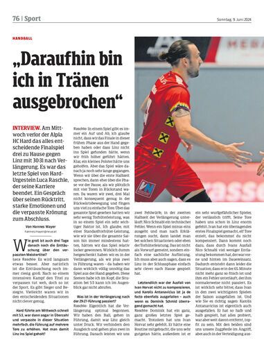 Interview. Am Mittwoch verlor der Alpla HC Hard das alles entscheidende Finalspiel drei zu Hause gegen Linz mit 30:31 nach Verlängerung. Es war das letzte Spiel von Hard-Urgestein Luca Raschle, der seine Karriere beendet. Ein Gespräch über seinen Rücktritt, starke Emotionen und die verpasste Krönung zum Abschluss.