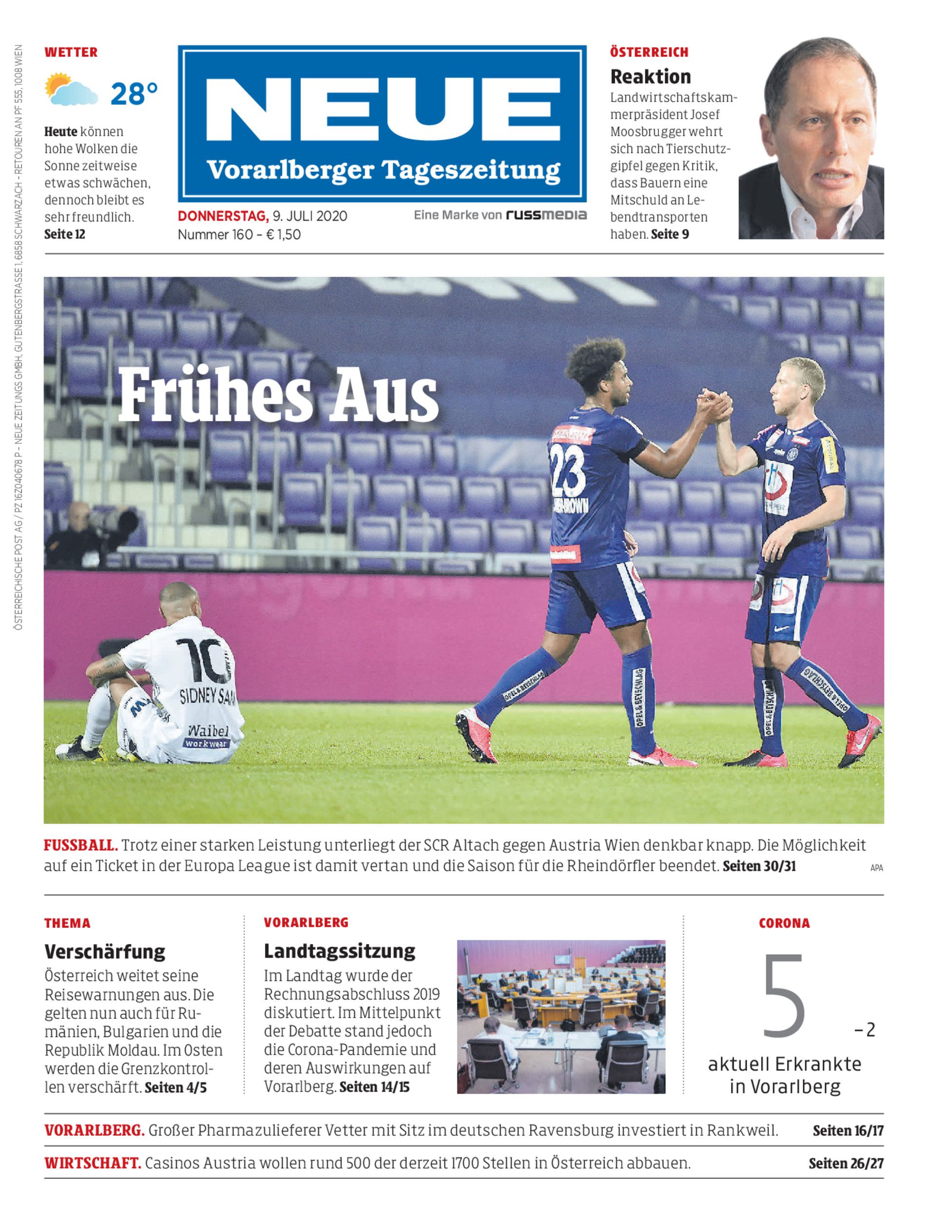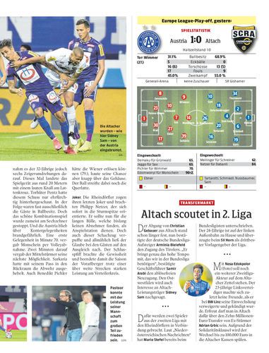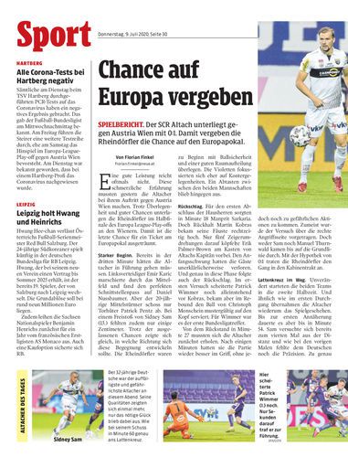 Fussball. Trotz einer starken Leistung unterliegt der SCR Altach gegen Austria Wien denkbar knapp. Die Möglichkeit auf ein Ticket in der Europa League ist damit vertan und die Saison für die Rheindörfler beendet. Seiten 30/31 APa
