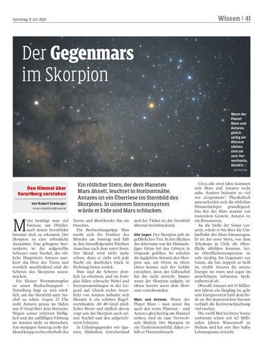 Ein rötlicher Stern, der dem Planeten Mars ähnelt, leuchtet in Horizontnähe. Antares ist ein Überriese im Sternbild des Skorpions. In unserem Sonnensystem würde er Erde und Mars schlucken.