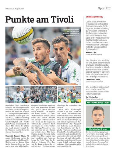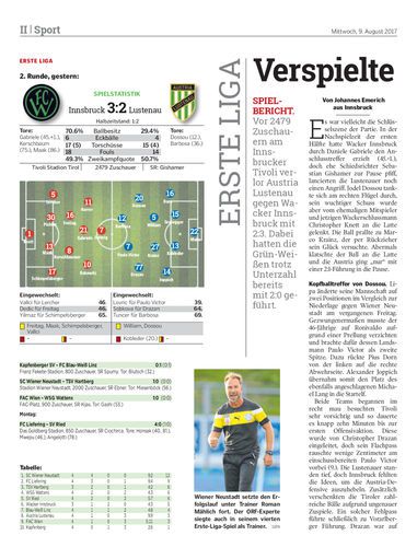 Spielbericht. Vor 2479 Zuschauern am Innsbrucker Tivoli verlor Austria Lustenau gegen Wacker Innsbruck mit 2:3. Dabei hatten die Grün-Weißen trotz Unterzahl bereits mit 2:0 geführt.