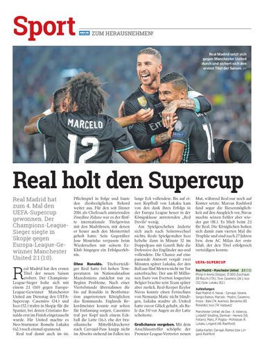 Real Madrid hat zum 4. Mal den UEFA-Supercup gewonnen. Der Champions-League-Sieger siegte in Skopje gegen Europa-League-Gewinner Manchester United 2:1 (1:0).