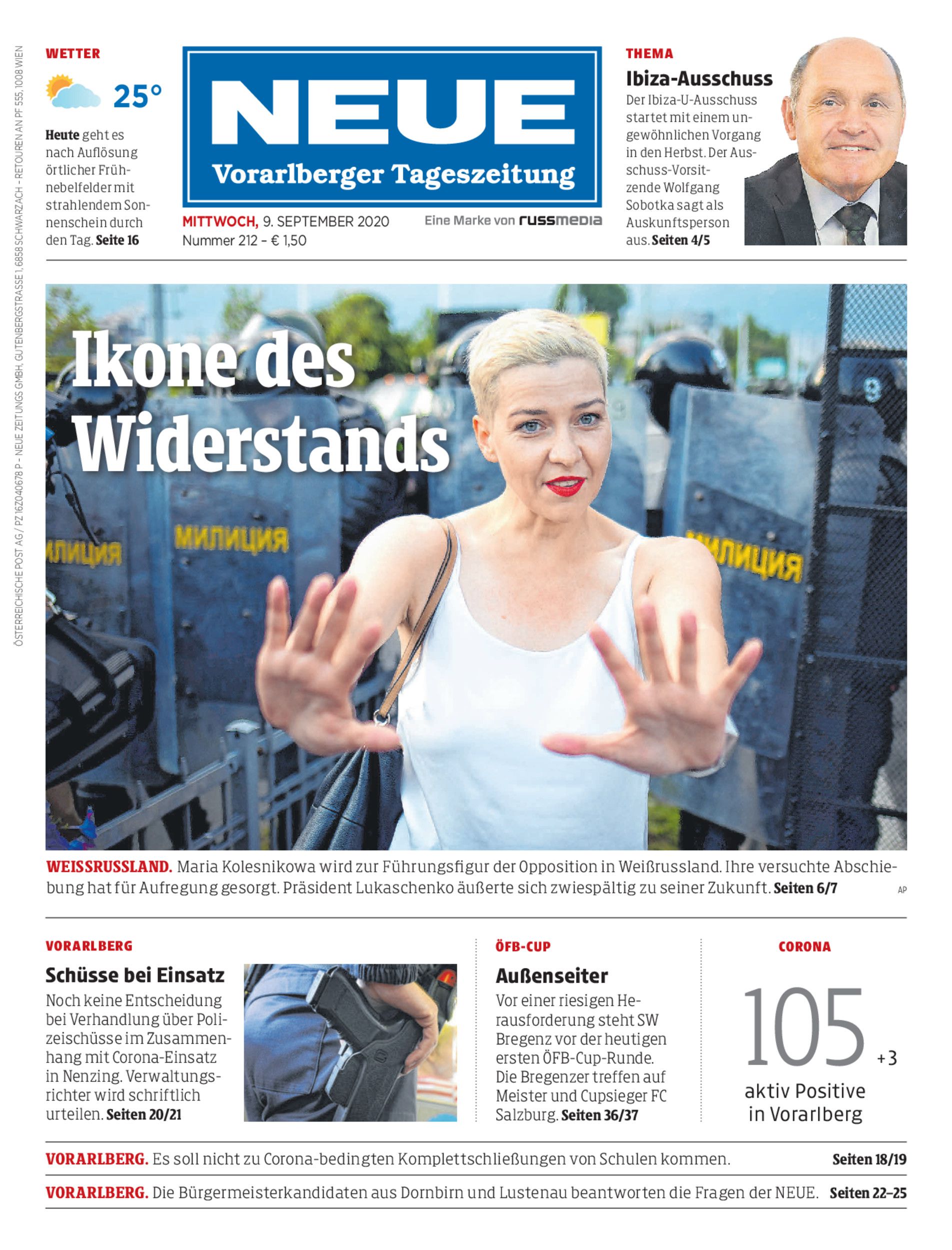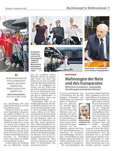 Weißrussland. Maria Kolesnikowa wird zur Führungsfigur der Opposition in Weißrussland. Ihre versuchte Abschiebung hat für Aufregung gesorgt. Präsident Lukaschenko äußerte sich zwiespältig zu seiner Zukunft. Seiten 6/7 AP