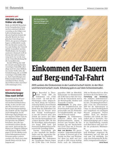 2019 sanken die Einkommen in der Landwirtschaft leicht, in der Obst- und Forstwirtschaft stark. Erholung gab es auf dem Schweinemarkt.