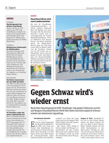 Nach dem Spaziergang im EHF-Challenge-Cup gegen Ciobruciu wartet auf Bregenz Handball heute (19.30 Uhr) beim Auswärtsspiel in Schwaz wieder der heimische Ligaalltag.