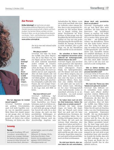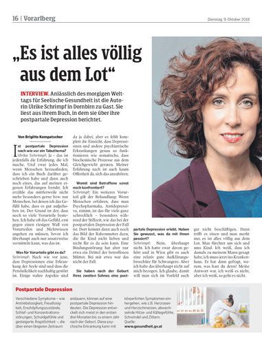 Interview. Anlässlich des morgigen Welttags für Seelische Gesundheit ist die Autorin Ulrike Schrimpf in Dornbirn zu Gast. Sie liest aus ihrem Buch, in dem sie über ihre postpartale Depression berichtet.