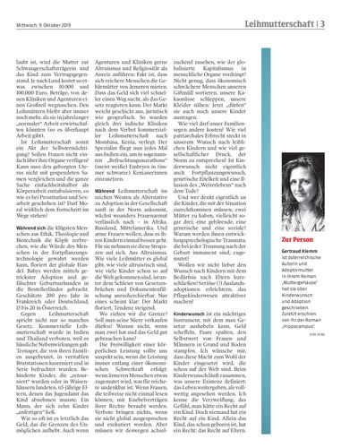 Leihmutterschaft ist in der Normalität gelandet. Obwohl es bei uns verboten ist, werden Kinder im Ausland ausgetragen und durch rechtliche Tricksereien hier legitimiert. Darf die Ethik dem Fortschritt im Wege stehen? Wie weit darf Kinderwunsch gehen? Von Gertraud Klemm