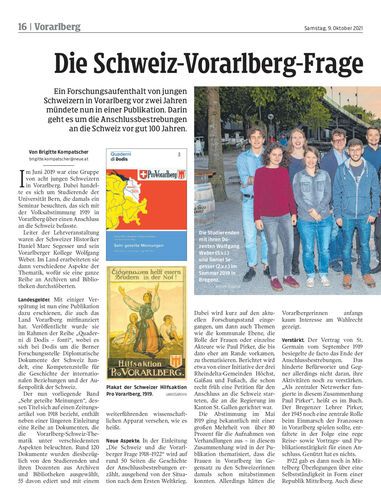 Ein Forschungsaufenthalt von jungen Schweizern in Vorarlberg vor zwei Jahren mündete nun in einer Publikation. Darin geht es um die Anschlussbestrebungen an die Schweiz vor gut 100 Jahren.