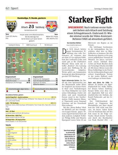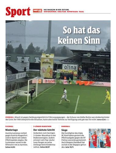 Spielbericht. Nach torloser erster Halbzeit liefern sich Altach und Salzburg einen Schlagabtausch. Endstand 2:3. Wieder einmal wurde der Video-Assistant-Referee (VAR) ad absurdum geführt.
