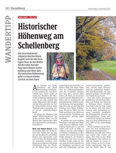 Die Geschichtenerzählerin Hertha Glück begibt sich bei der heutigen Tour ab der Nofler Kirche über Auf der Egg nach Hinter Schellenberg und über den Historischen Höhenweg geht es dann wieder zurück an den Start.