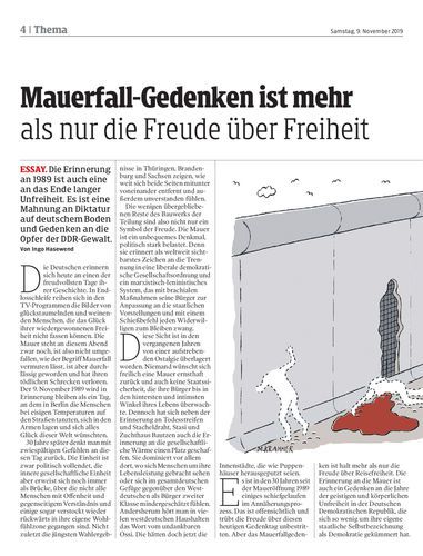 ESSAY. Die Erinnerung an 1989 ist auch eine an das Ende langer Unfreiheit. Es ist eine Mahnung an Diktatur auf deutschem Boden und Gedenken an die Opfer der DDR-Gewalt. Von Ingo Hasewend