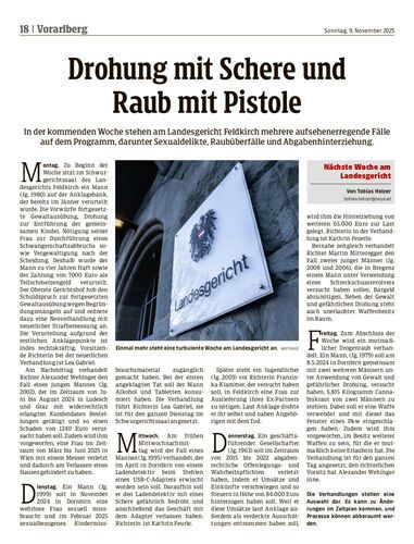 In der kommenden Woche stehen am Landesgericht Feldkirch mehrere aufsehenerregende Fälle auf dem Programm, darunter Sexualdelikte, Raubüberfälle und Abgabenhinterziehung.