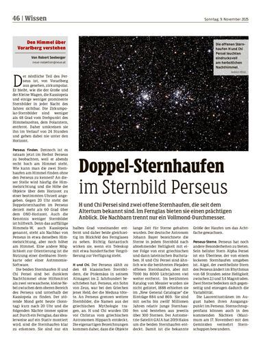 H und Chi Persei sind zwei offene Sternhaufen, die seit dem Altertum bekannt sind. Im Fernglas bieten sie einen prächtigen Anblick. Die Nachbarn trennt nur ein Vollmond-Durchmesser.