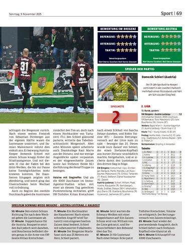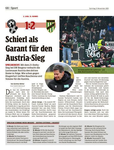 Spielbericht. Mit dem 2:1-Derby-Sieg bei SW Bregenz verbucht die Lustenauer Austria den dritten Dreier in Folge. Wie schon gegen Klagenfurt treffen Bouchenna und Voisine für die Austria.