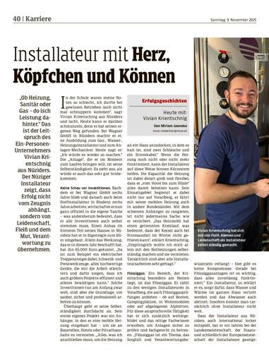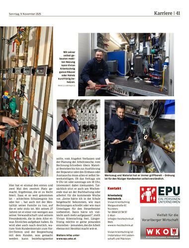 „Ob Heizung, Sanitär oder Gas – do isch Leistung dahinter.“ Das ist der Leitspruch des Ein-Personen-Unternehmers Vivian Krientschnig aus Nüziders. Der Nüziger Installateur zeigt, dass Erfolg nicht vom Zeugnis abhängt, sondern von Leidenschaft, Fleiß und dem Mut, Verantwortung zu übernehmen.