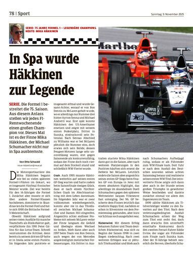 Serie. Die Formel 1 bestreitet die 75. Saison. Aus diesem Anlass stellen wir jedes F1-Rennwochenende einen großen Champion vor. Dieses Mal ist es der Finne Mika Häkkinen, der Michael Schumacher nicht nur in Spa ausbremste.