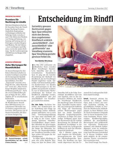 Sutterlüty gewann Rechtsstreit gegen Spar. Spar erbrachte nicht den Beweis, dass angebotenes Rindfleisch wirklich „ausschließlich“, „fast ausschließlich“ oder „größtenteils“ aus Vorarlberg stammte. Spar Vorarlberg gesteht gewisse Fehler ein.