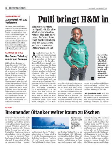 Modekette erntete heftige Kritik für eine Werbung und nahm Artikel aus dem Sortiment: Auf dem Foto trägt dunkelhäutiger Bub ein Sweatshirt, auf dem von einem „Affen“ zu lesen ist.