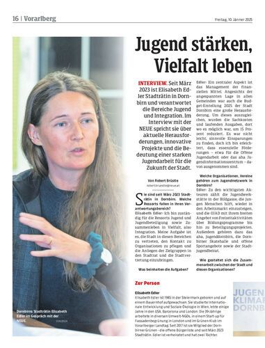 Interview. Seit März 2023 ist Elisabeth Edler Stadträtin in Dornbirn und verantwortet die Bereiche Jugend und Integration. Im Interview mit der NEUE spricht sie über aktuelle Herausforderungen, innovative Projekte und die Bedeutung einer starken Jugendarbeit für die Zukunft der Stadt.