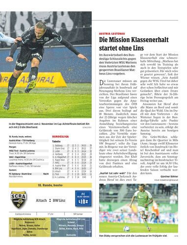 Im Auswärtsduell des Bundesliga-Schlusslichts gegen den Vorletzten WSG Wattens muss Austria Lustenau den gesperrten Brasilianer Matheus Lins vorgeben.