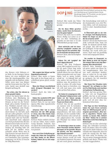 Dopingsünder Dominik Baldauf (Seiten 72/73) zeichnet den Weg zum Sportbetrug auf, Systemkritikerin Nicola Werdenigg erklärt, wie das System ÖSV bei der Dopingaufklärung wirkt.