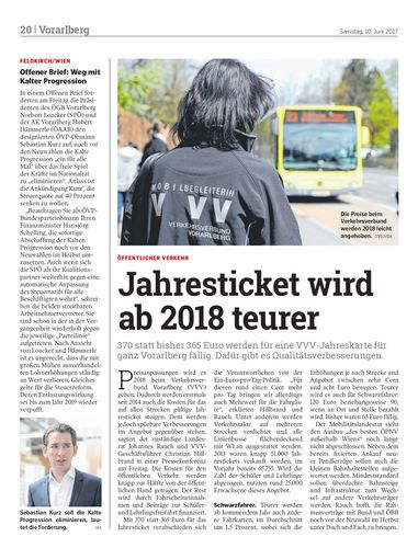 370 statt bisher 365 Euro werden für eine VVV-Jahreskarte für ganz Vorarlberg fällig. Dafür gibt es Qualitätsverbesserungen.