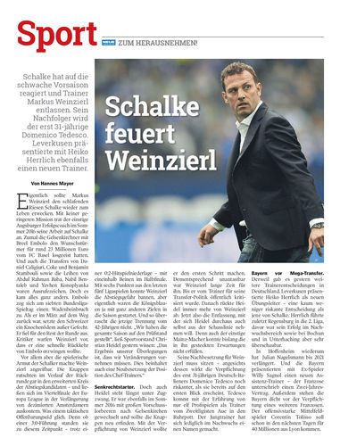 Schalke hat auf die schwache Vorsaison reagiert und Trainer Markus Weinzierl entlassen. Sein Nachfolger wird der erst 31-jährige Domenico Tedesco. Leverkusen präsentierte mit Heiko Herrlich ebenfalls einen neuen Trainer.