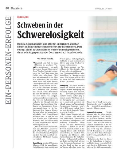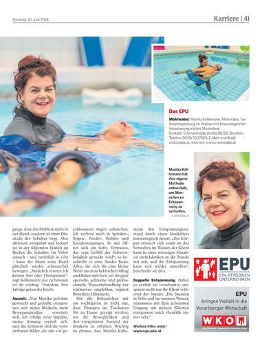 Monika Köllemann lebt und arbeitet in Dornbirn. Unter anderem im Schwimmbecken der SeneCura-Parkresidenz. Dort bewegt sie im 35 Grad warmen Wasser Schmerzpatienten, chronisch Angespannte oder Gestresste nach ihrer Methode.
