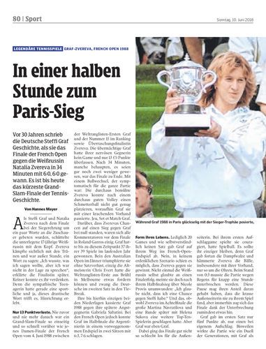 Vor 30 Jahren schrieb die Deutsche Steffi Graf Geschichte, als sie das Finale der French Open gegen die Weißrussin Natalia Zvereva in 34 Minuten mit 6:0, 6:0 gewann. Es ist bis heute das kürzeste Grand-Slam-Finale der Tennis-Geschichte.