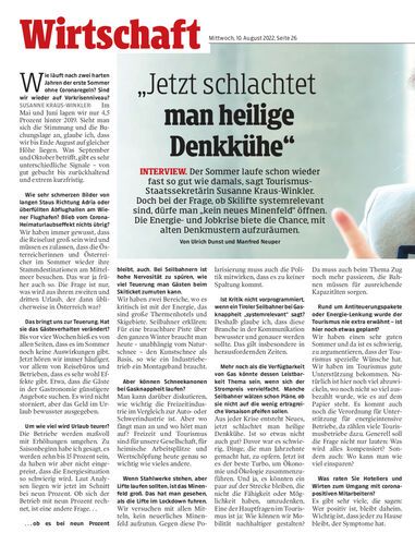Der Sommer laufe schon wieder fast so gut wie damals, sagt Tourismus- Staatssekretärin Susanne Kraus-Winkler. Doch bei der Frage, ob Skilifte systemrelevant sind, dürfe man „kein neues Minenfeld“ öffnen. Die Energie- und Jobkrise biete die Chance, mit alten Denkmustern aufzuräumen. Von Ulrich Dunst und Manfred Neuper