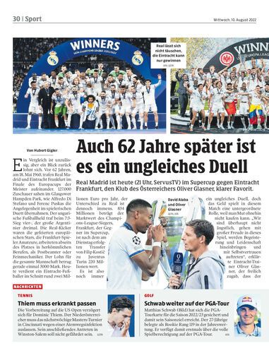 Real Madrid ist heute (21 Uhr, ServusTV) im Supercup gegen Eintracht Frankfurt, den Klub des Österreichers Oliver Glasner, klarer Favorit.