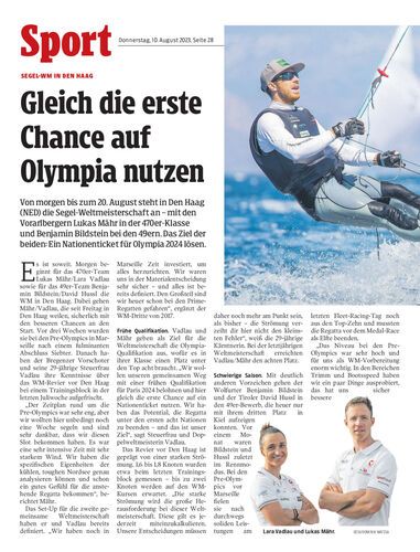Von morgen bis zum 20. August steht in Den Haag (NED) die Segel-Weltmeisterschaft an – mit den Vorarlbergern Lukas Mähr in der 470er-Klasse und Benjamin Bildstein bei den 49ern. Das Ziel der beiden: Ein Nationenticket für Olympia 2024 lösen.