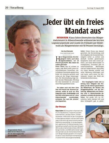 Interview. Klaus Sohm übernahm das Bürgermeisteramt in Alberschwende während der letzten Legislaturperiode und wurde im Frühjahr per Direktwahl als Bürgermeister mit 92 Prozent bestätigt.