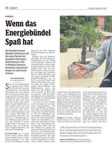 Der Harder Samuel Wendel (24) brennt auf die neue Saison bei Handball-Drittligist HSG Konstanz. Der in Bregenz bestens bekannte Jörg Lützelberger ist sein neuer Trainer.
