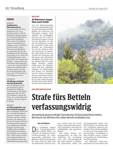 Anwendung gesetzwidriger Verordnung: Verfassungsrichter hoben BH-Strafe von 300 Euro für stilles Betteln in Bludenz auf.