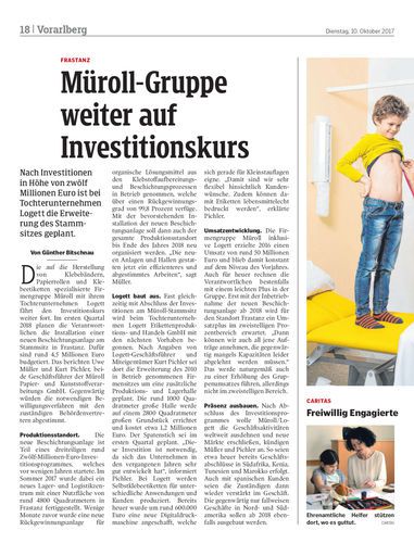 Nach Investitionen in Höhe von zwölf Millionen Euro ist bei Tochterunternehmen Logett die Erweiterung des Stammsitzes geplant.
