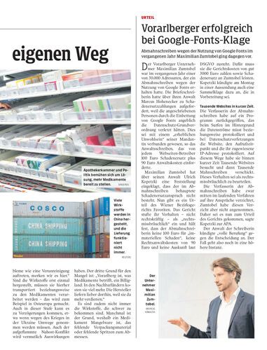 Abmahnschreiben wegen der Nutzung von Google Fonts im vergangenen Jahr: Maximilian Zumtobel ging dagegen vor.