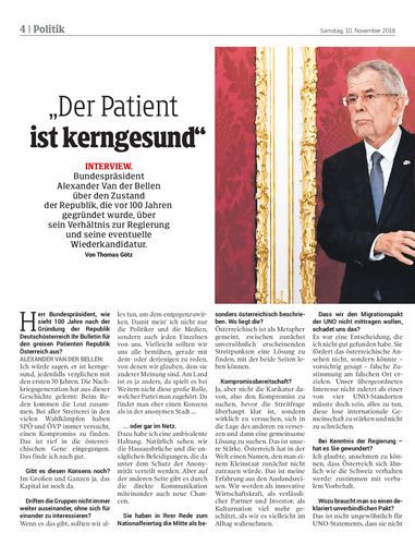Bundespräsident Alexander Van der Bellen über den Zustand der Republik, die vor 100 Jahren gegründet wurde, über sein Verhältnis zur Regierung und seine eventuelle Wiederkandidatur. Von Thomas Götz