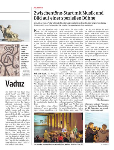 Mit „Silent Stories“ starteten die Montforter Zwischentöne. Drei Musiker improvisierten zu Bildergeschichten. Schauplatz: die von Juri Troy gestaltete Pop-up-Bühne.