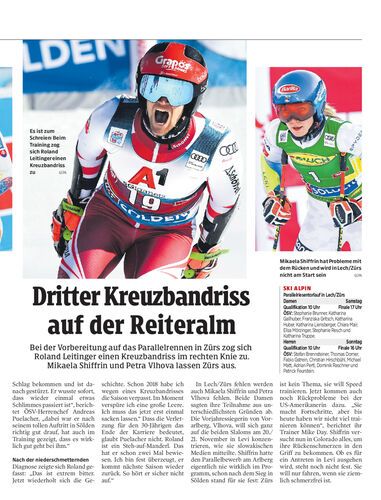 Bei der Vorbereitung auf das Parallelrennen in Zürs zog sich Roland Leitinger einen Kreuzbandriss im rechten Knie zu. Mikaela Shiffrin und Petra Vlhova lassen Zürs aus.