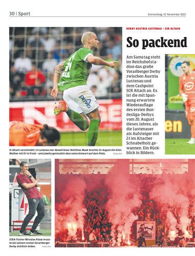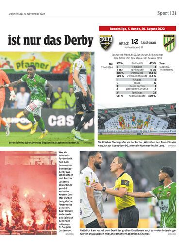 Am Samstag steht im Reichshofstadion das große Vorarlberger Derby zwischen Austria Lustenau und dem Cashpoint SCR Altach an. Es ist die mit Spannung erwartete Wiederauflage des ersten Bundesliga-Derbys vom 20. August dieses Jahres, als die Lustenauer als Aufsteiger mit 2:1 im Altacher Schnabelholz gewannen. Ein Rückblick in Bildern.