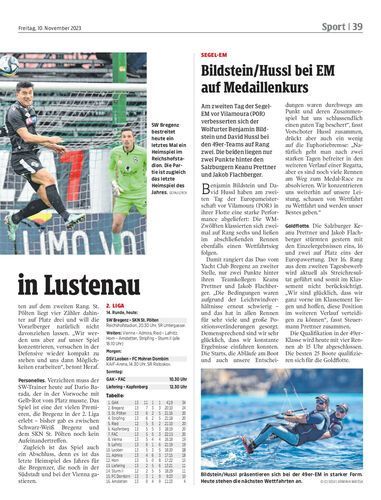 Am zweiten Tag der Segel-EM vor Vilamoura (POR) verbesserten sich der Wolfurter Benjamin Bildstein und David Hussl bei den 49er-Teams auf Rang zwei. Die beiden liegen nur zwei Punkte hinter den Salzburgern Keanu Prettner und Jakob Flachberger.