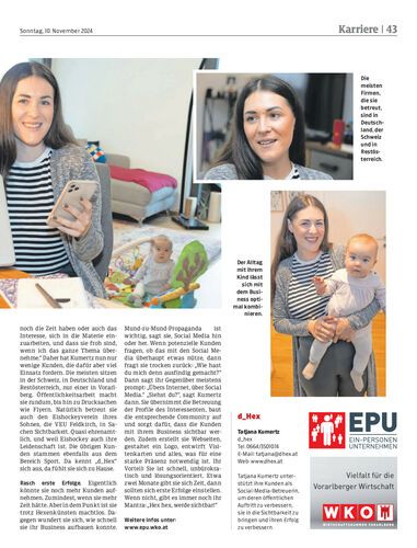 Tatjana Kumertz hat sich als Social-Media-Beraterin nicht nur selber verwirklicht. Sie hat das mit einem Beruf getan, der außerdem hervorragend zu ihrem Baby und ihrer Familie, zu dem Beruf ihres Mannes passt. „d_Hex“ sorgt für einen öffentlichen Auftritt ihrer Kunden, der ihnen spürbar mehr Zulauf beschert.