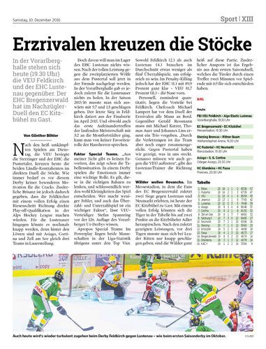 In der Vorarlberghalle stehen sich heute (19.30 Uhr) die VEU Feldkirch und der EHC Lustenau gegenüber. Der EHC Bregenzerwald hat im Nachzügler-Duell den EC Kitzbühel zu Gast.